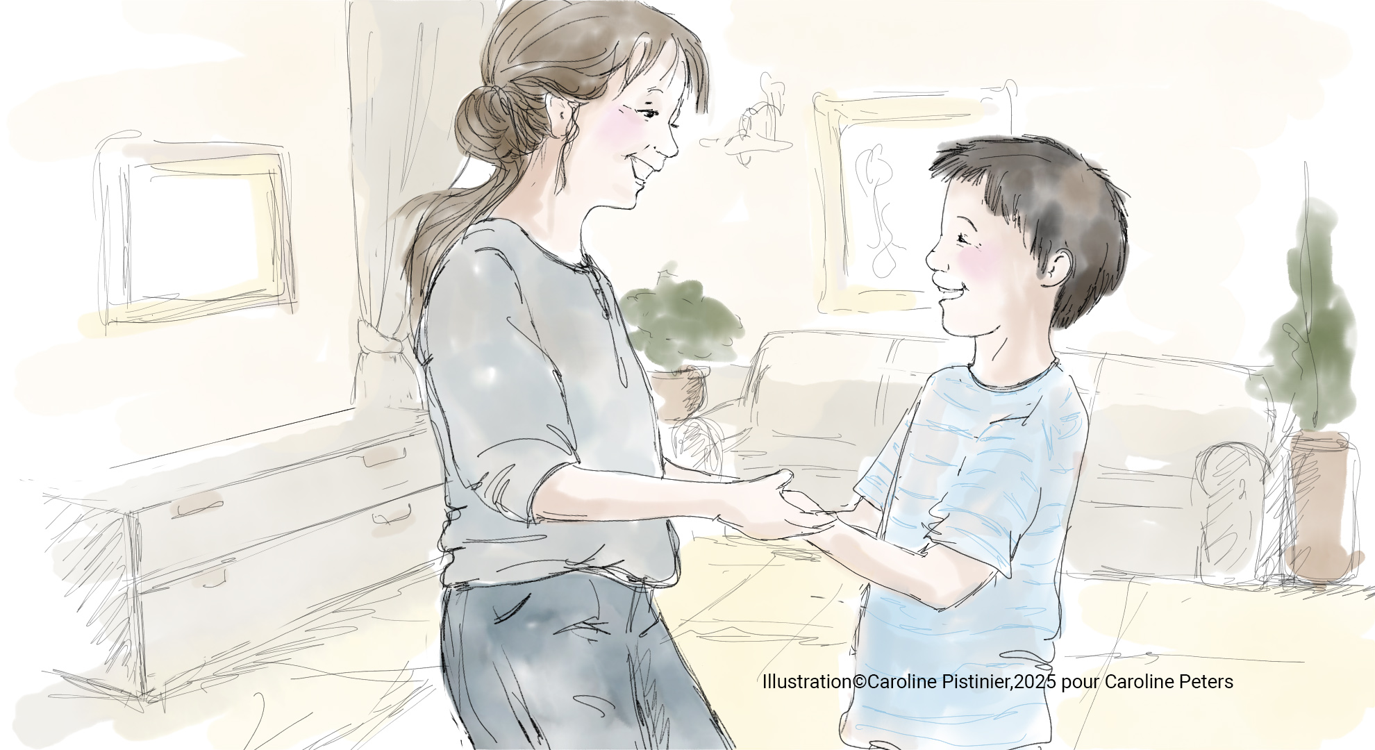 Je propose à sa mère de se mettre en face de lui, debout, et de se balancer doucement d’un pied à l’autre, en chantant une chanson qu’il aime. Elle essaie, mais Elias ne décroche pas. Il reste dans ses gestes répétitifs et dans son propre rythme, comme enfermé dans son monde.
