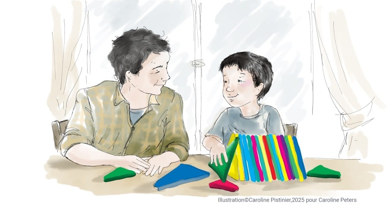 Je demande à son beau-père d’ajouter des mots à ce qui se passe. Donc, à chaque fois qu’Ellias met un “bon” triangle, de dire : “Oui ! Ça marche !” et puis, quand il met celui qui n’est pas pareil, de dire : “Oh non, ça ne marche pas !”