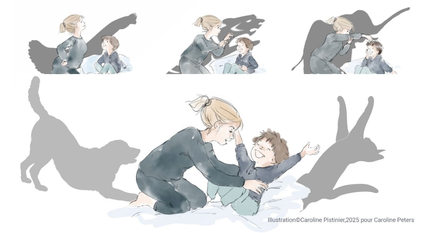 Par exemple : l’enfant montre ses griffes pour dire « tigre », fait un son, se met en position, met ses mains sur lui-même pour dire « mange-moi », ou prend vos mains pour les poser sur son corps — et l’adulte essaie alors de lui faire dire « tigre » ou « mange-moi ».